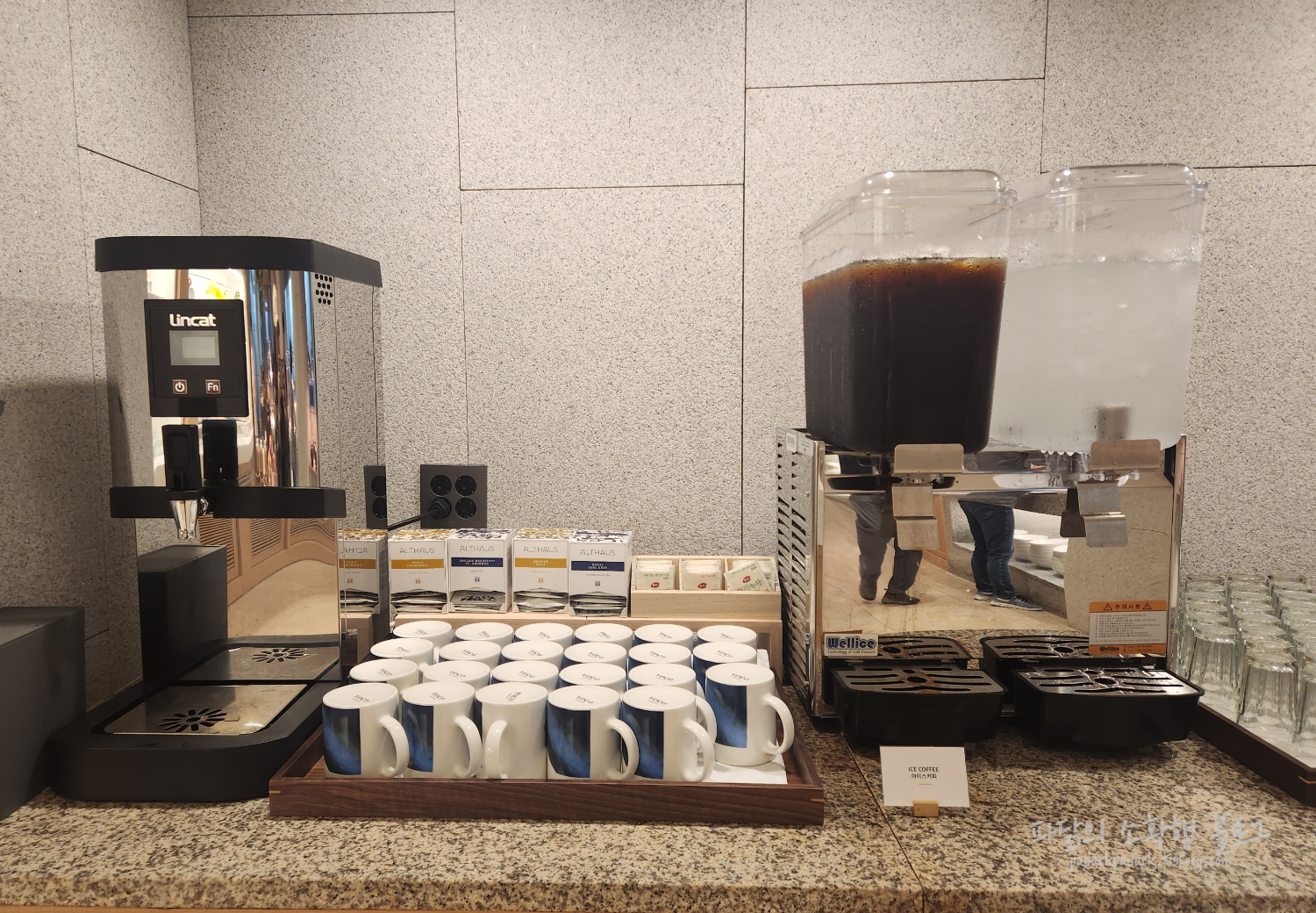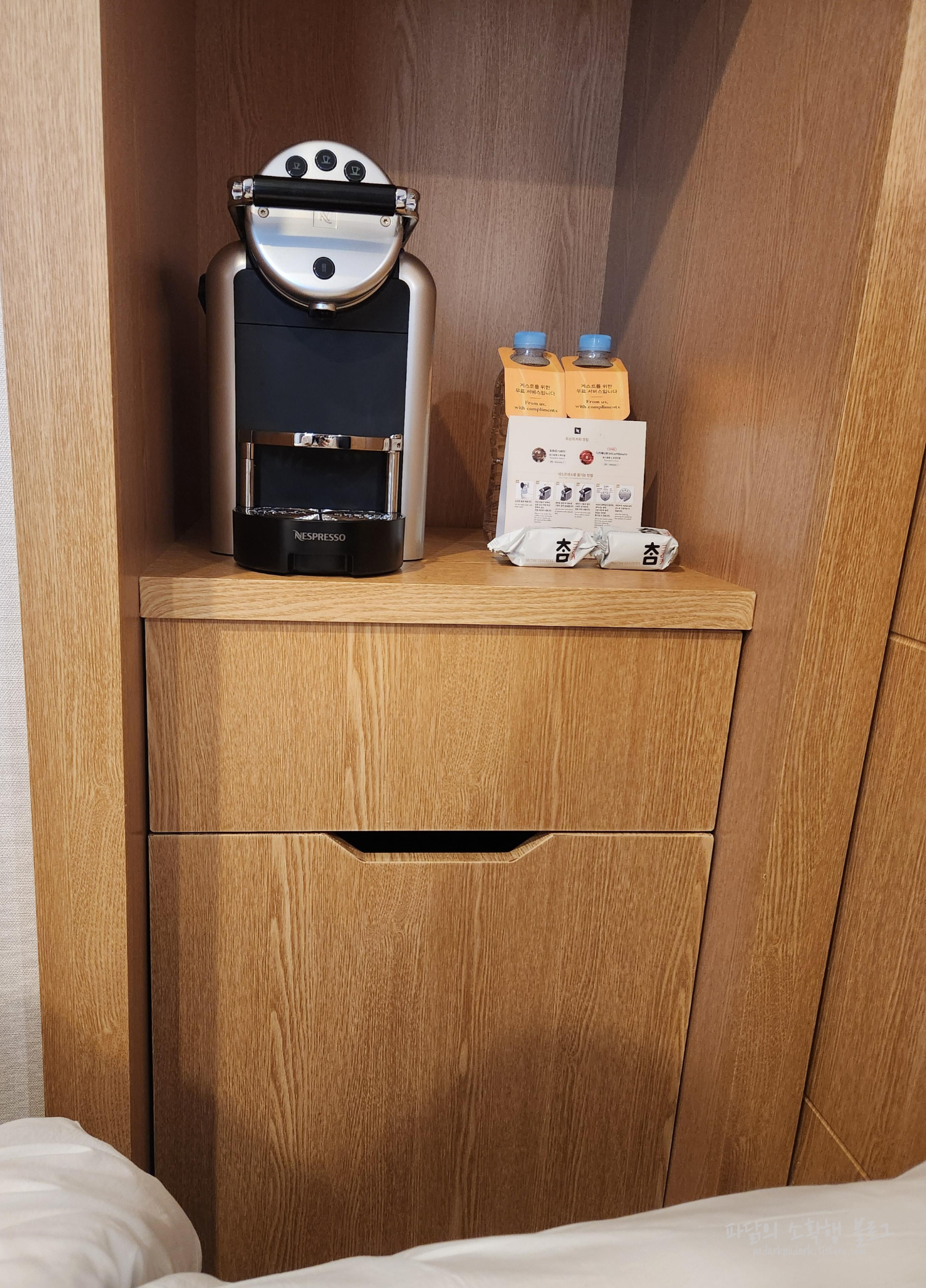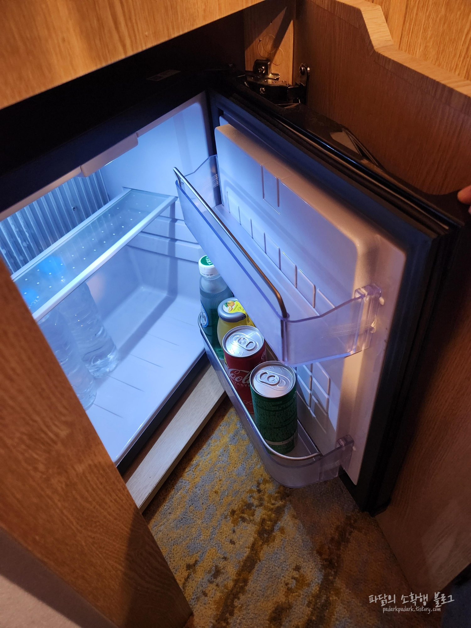 그대신 상시 행사로 가는건지, 오픈 이벤트 인지 모르겠지만 미니바는 다 무료라서 좋다. 그대신 주류는 없고 탄산수와 캔음료가 있고, 생수는 처음부터 넉넉하게 제공되는건 좋다. 커피머신과 함께 상온에 2병도 있고 냉장고에도 2병 더 있어서 넉넉하다.