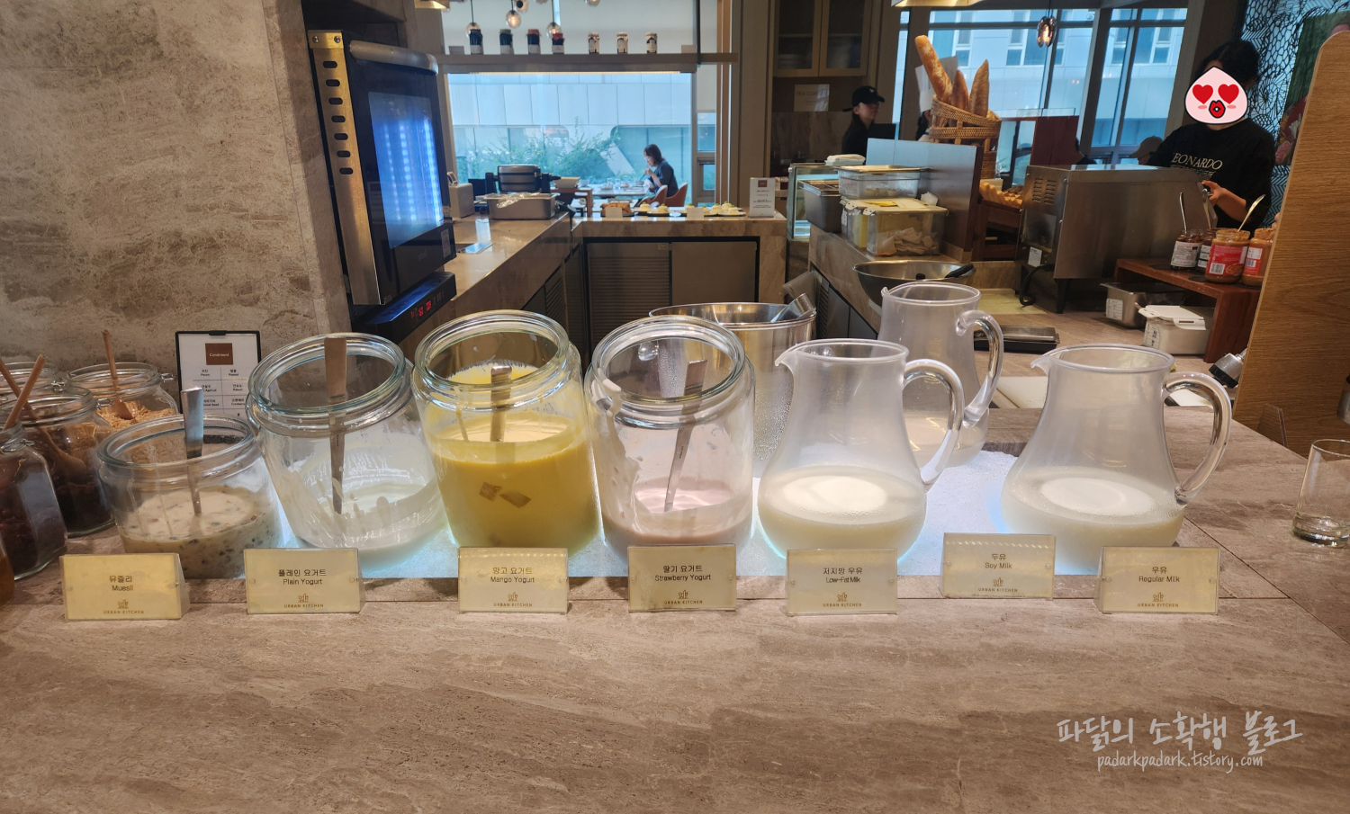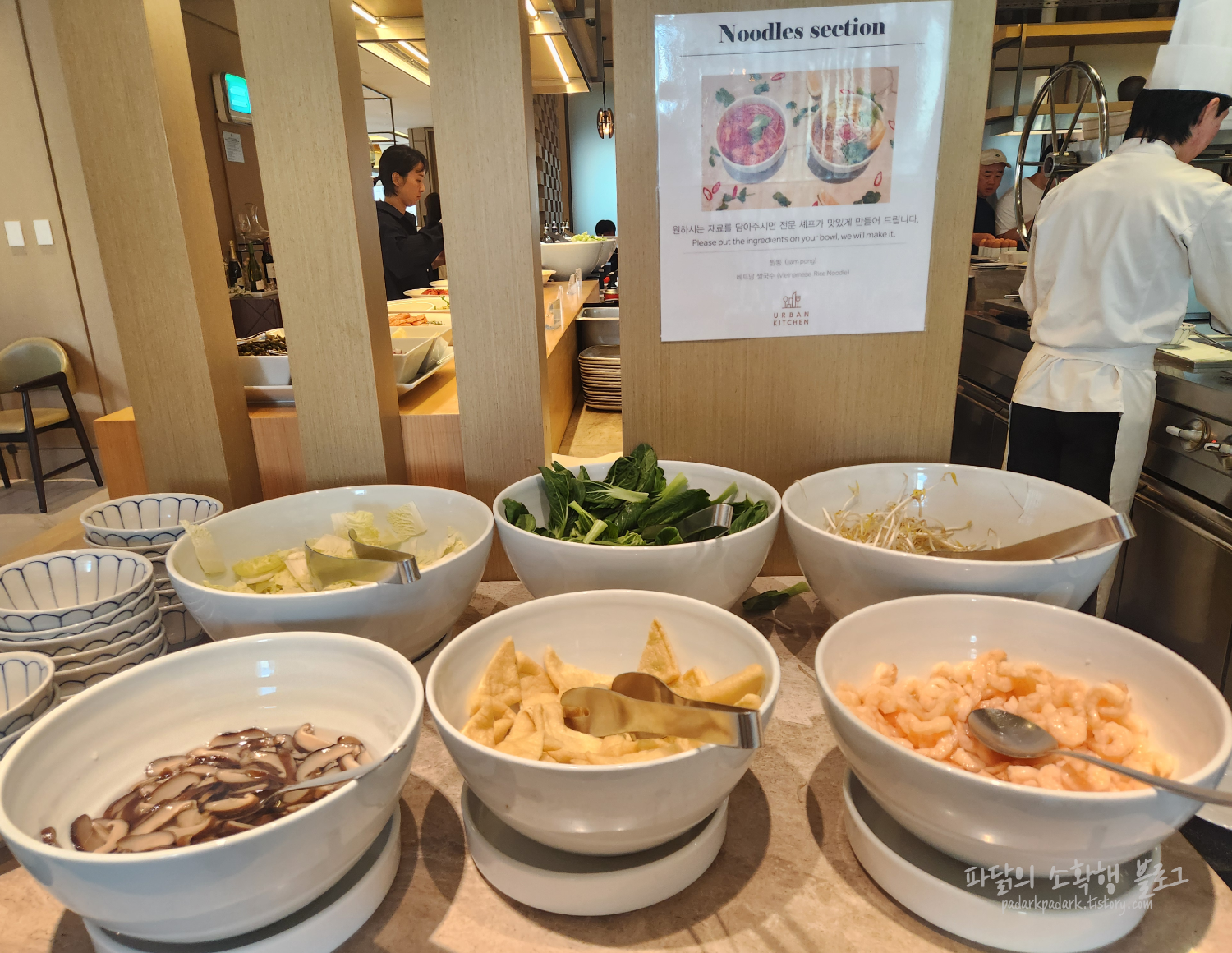 음식이 그렇게 다양하거나 한건 아니고 전형적인 호텔 조식 뷔페 입니다. 그나마 특징적인 건 빵 종류와 요거트 종류가 좀 많은 편이고, 누들 스테이션에서 쌀국수만 있는게 아니라 짬뽕도 있습니다. 맛이 없는 건 아닌데... 맛 있는데... 정말 맛있다고 할 정도는 아니에요. 전체적으로 무난무난 하게 괜찮습니다. 핫 스테이션 쪽 세팅과 서빙도 괜찮고, 아이들 먹을 메뉴들도 적당히 있고요. 아이스크림도 있어서 디저트 좋아하는 아이가 과일과 아이스크림을 아침부터 신나게 먹었어요.